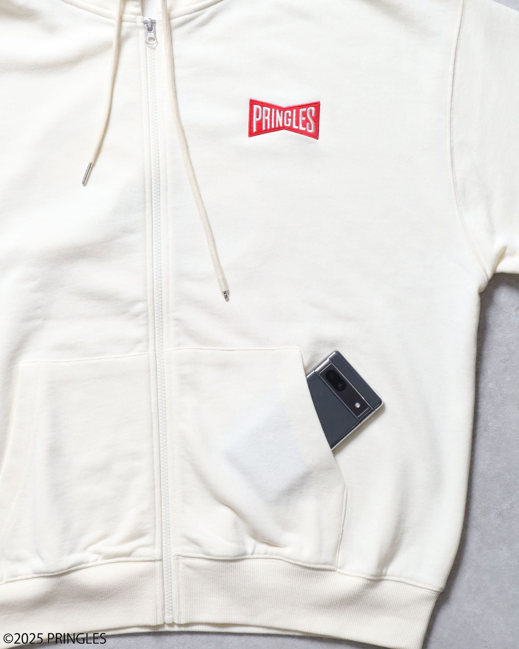 発泡プリントで表現されたMr.Pが目印のジップパーカー。