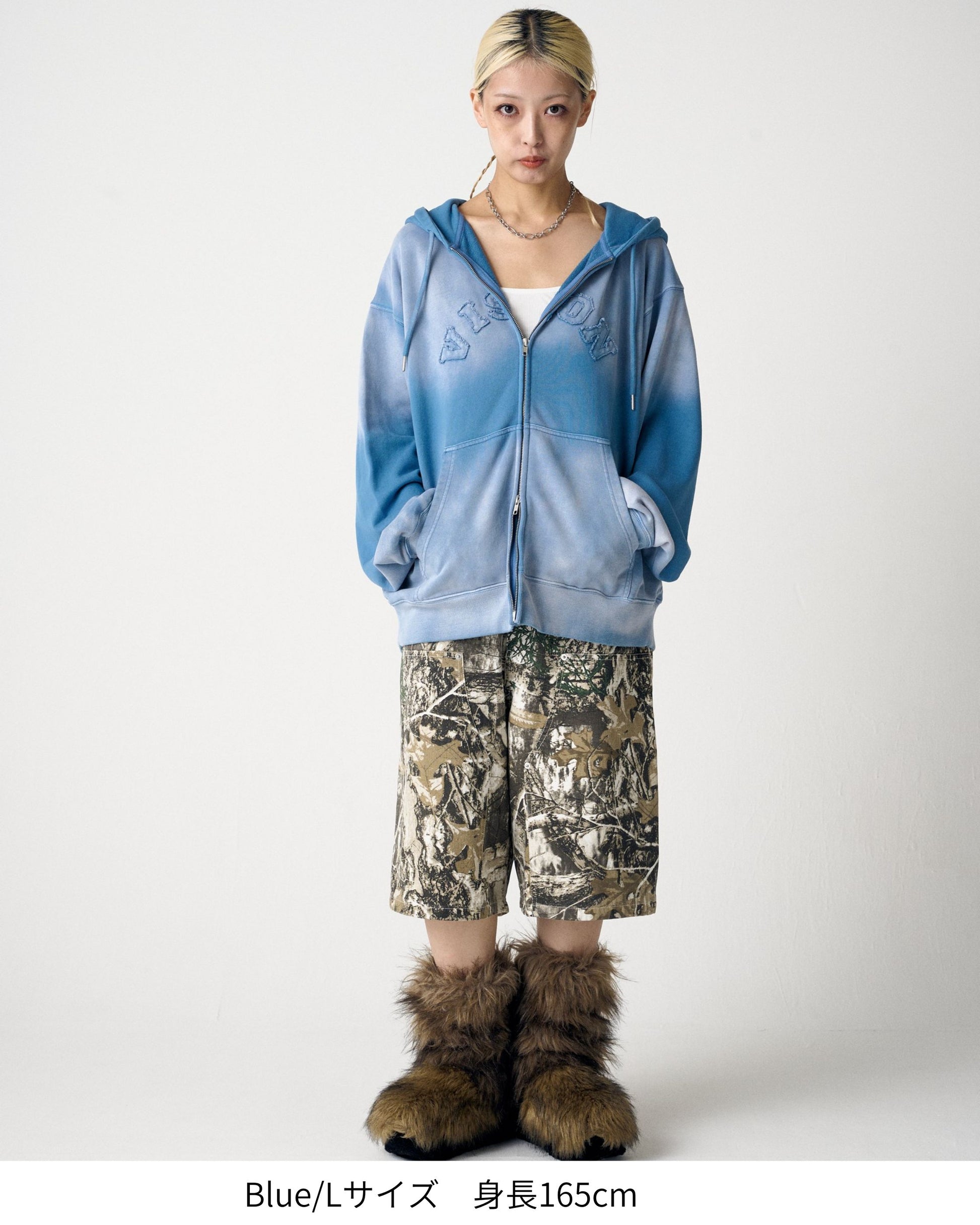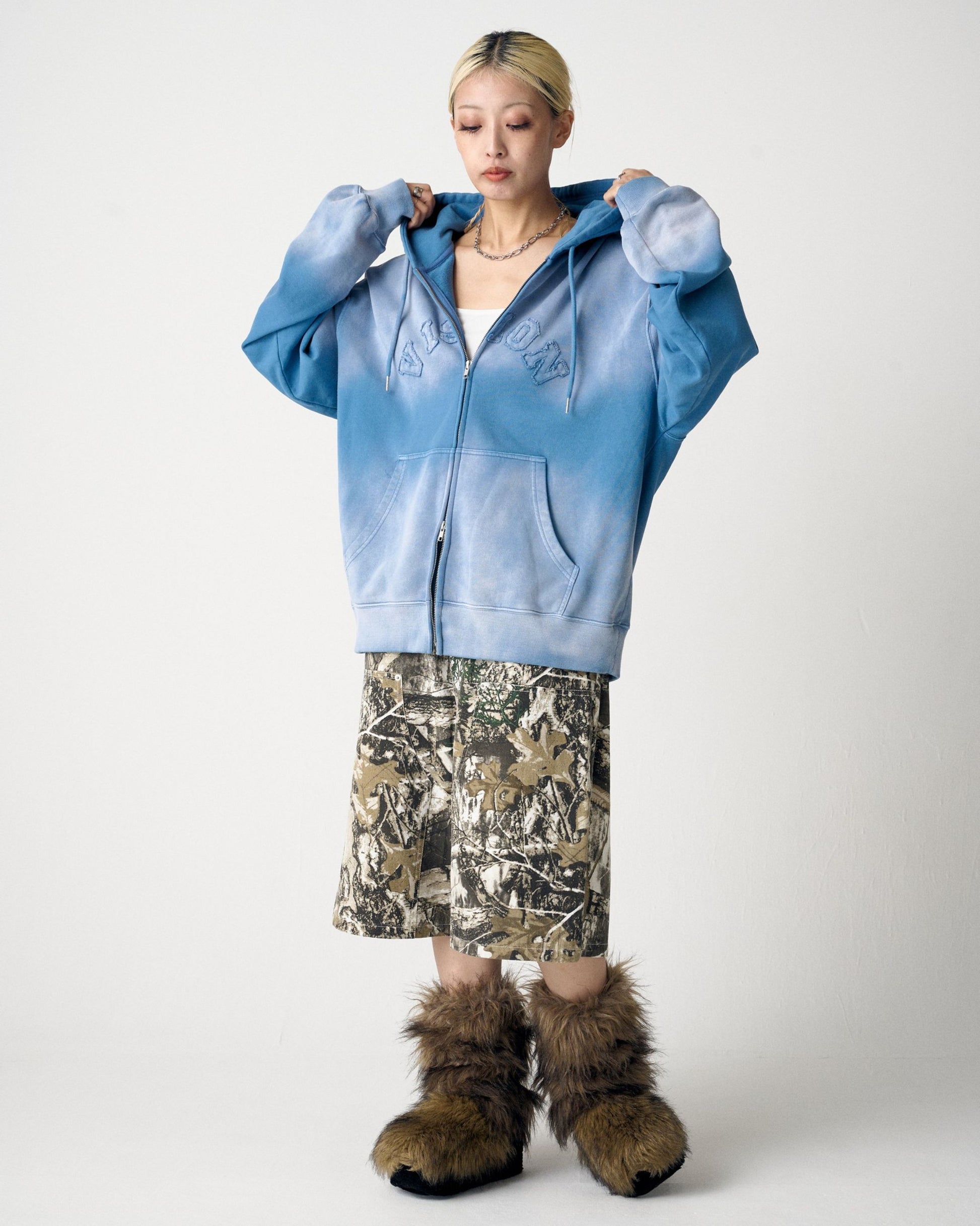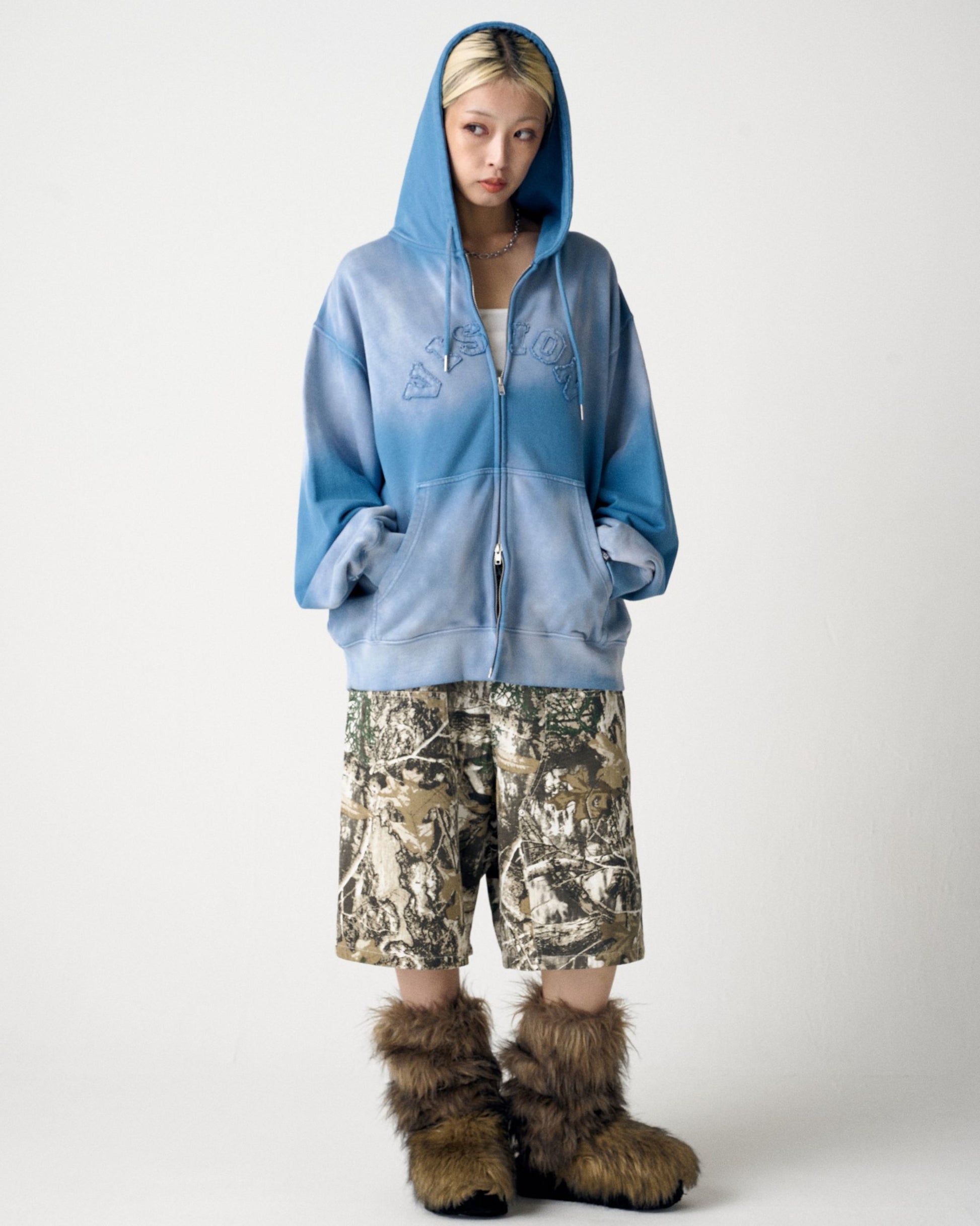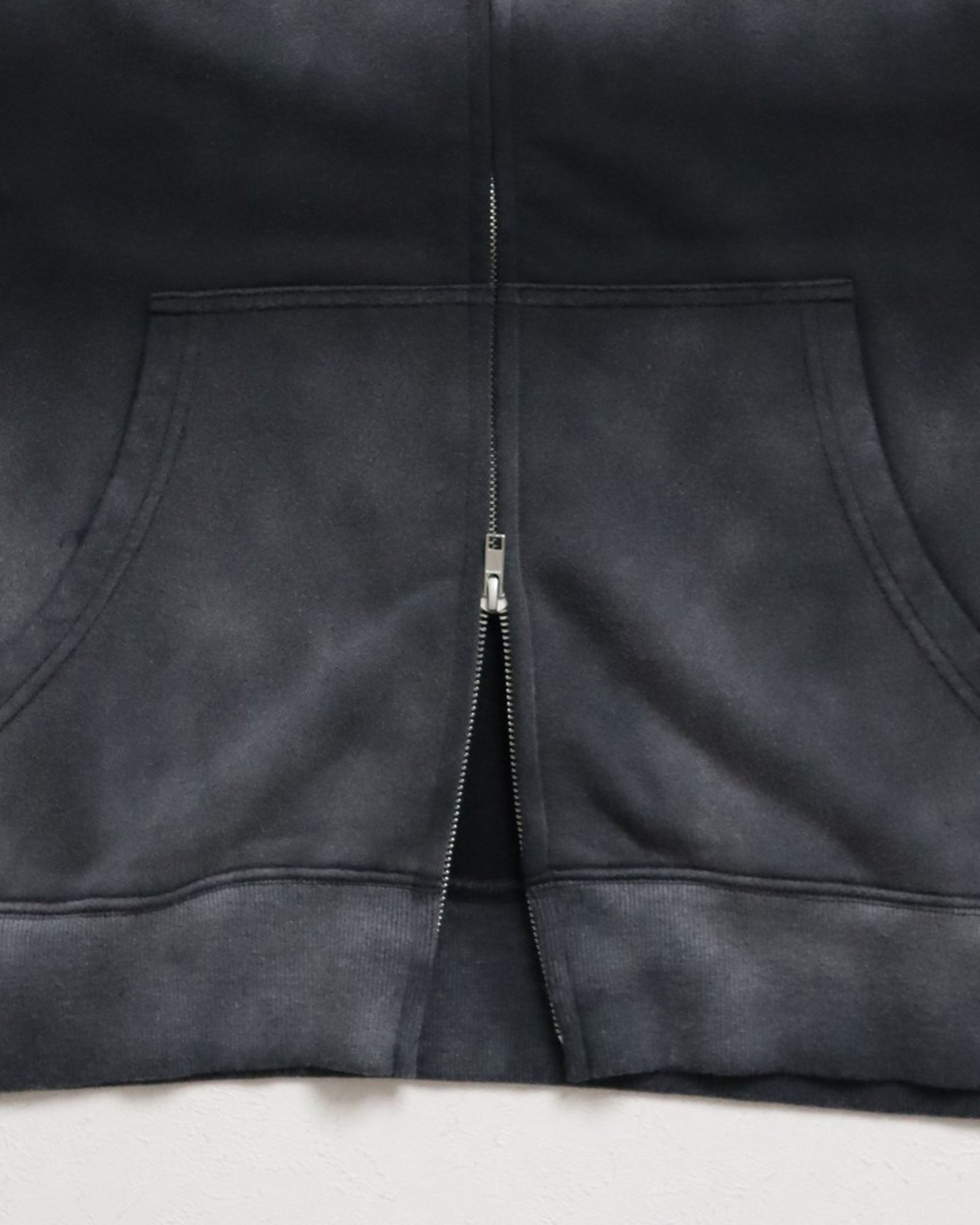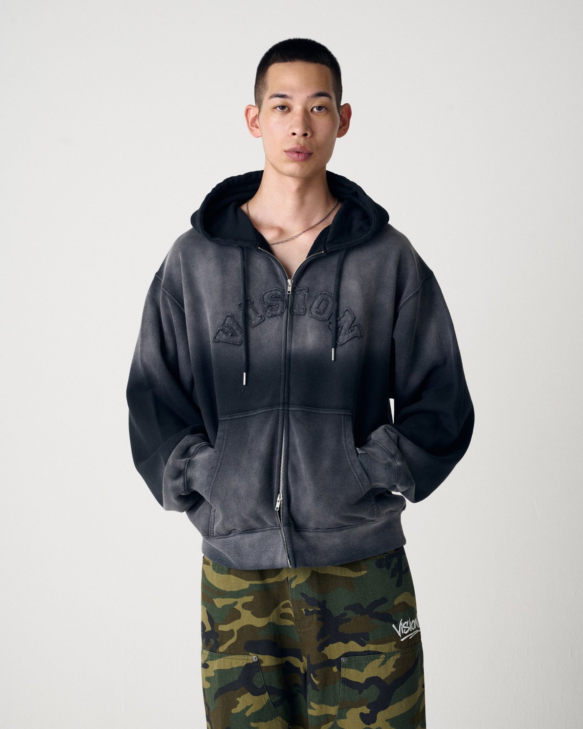 カレッジロゴ×ブリーチ加工を施したダブルジップパーカー