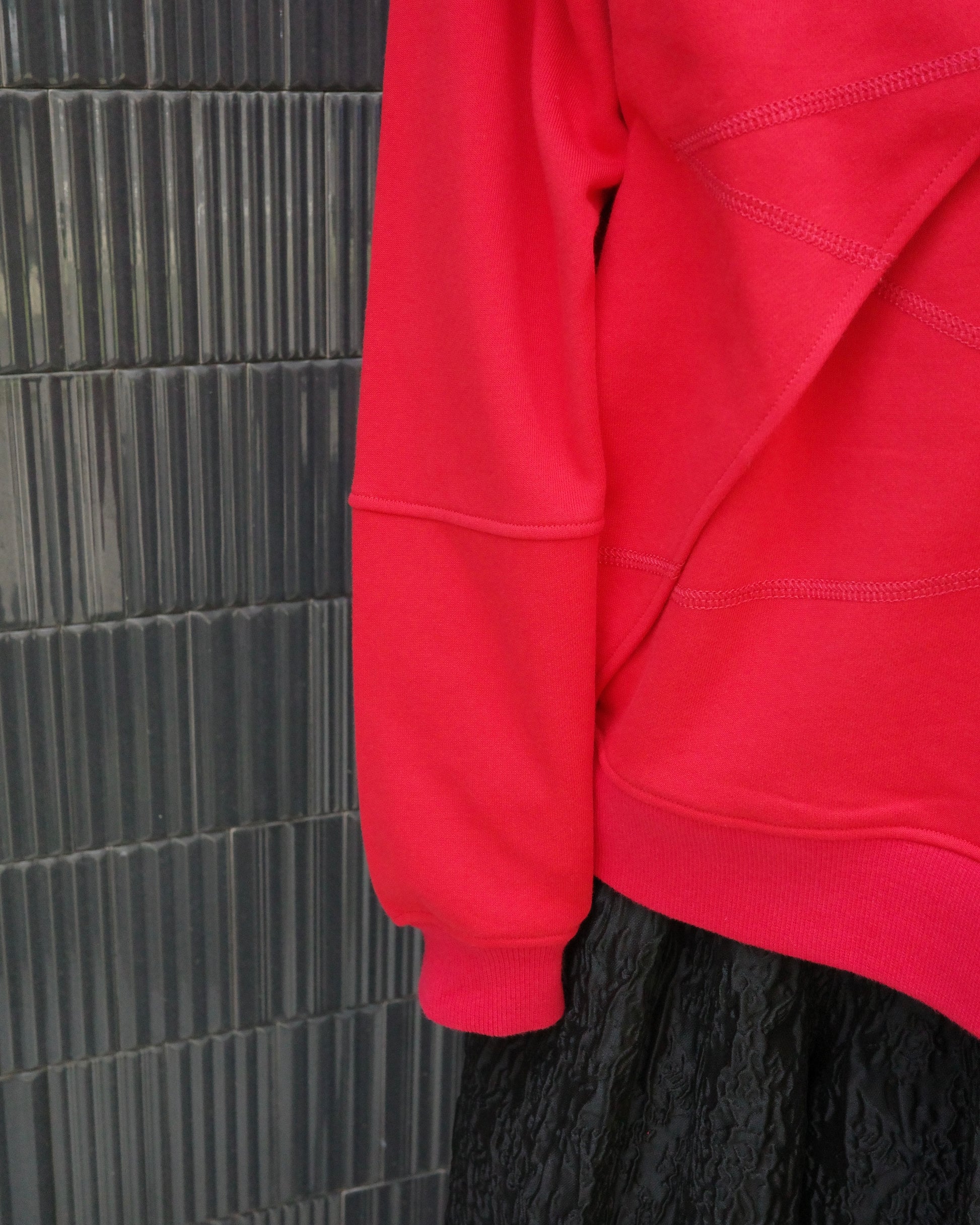 オーバーサイズながら、袖や裾に溜まりを少なくする事でスッキリとしたシルエットで着ていただけます。
