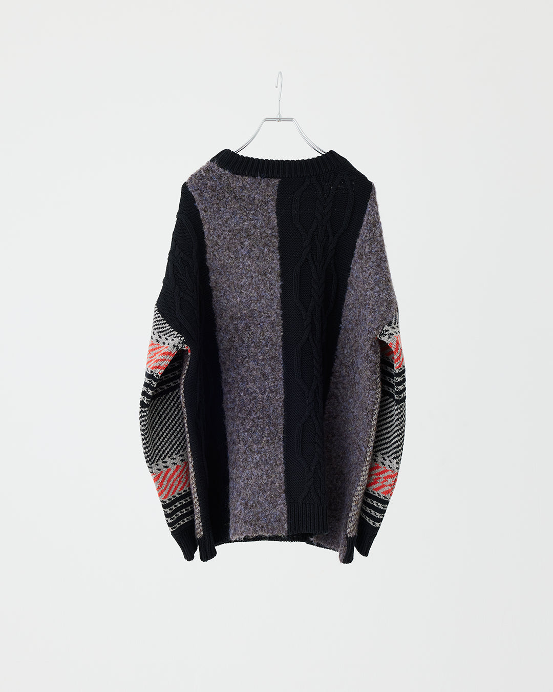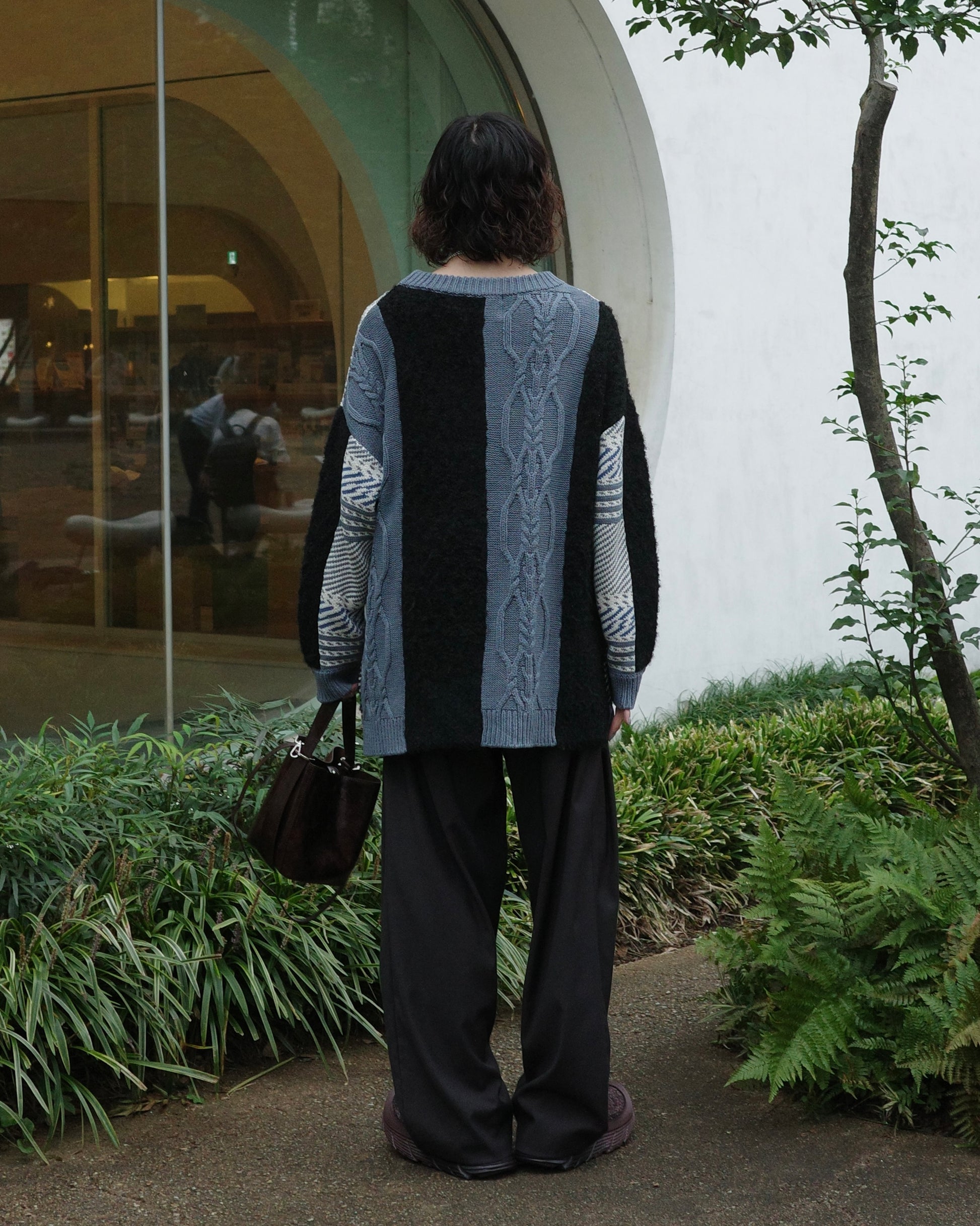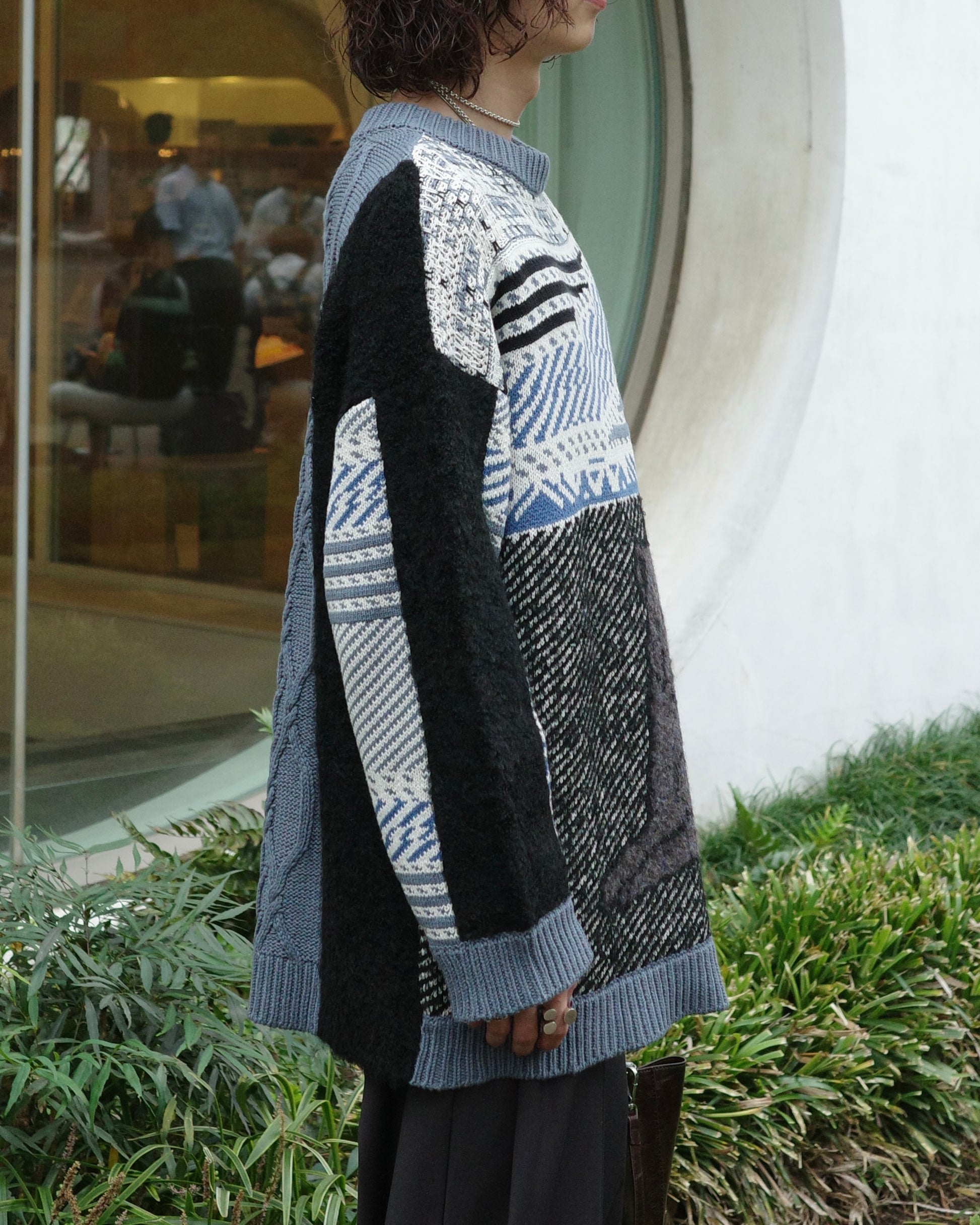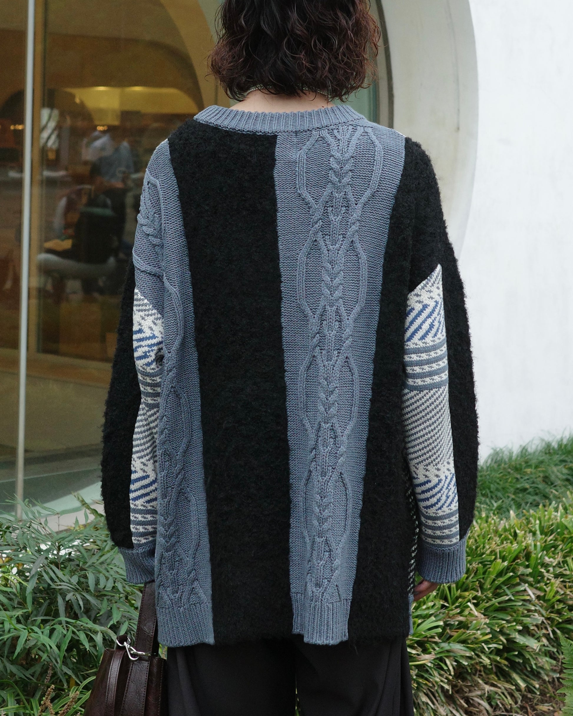 2種類の風合いの違う糸を使い、複数の編み柄を組み合わせたオーバーサイズニット。