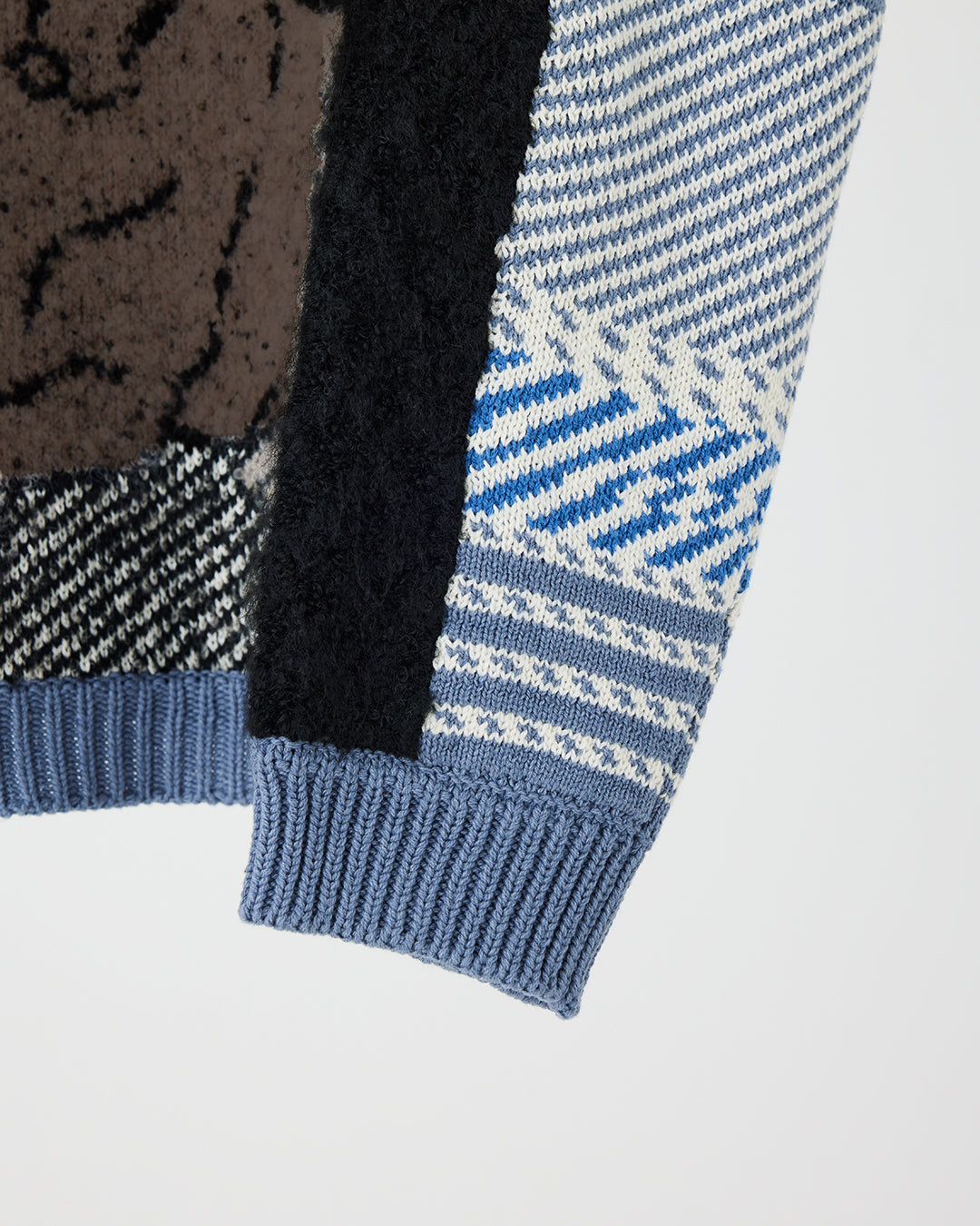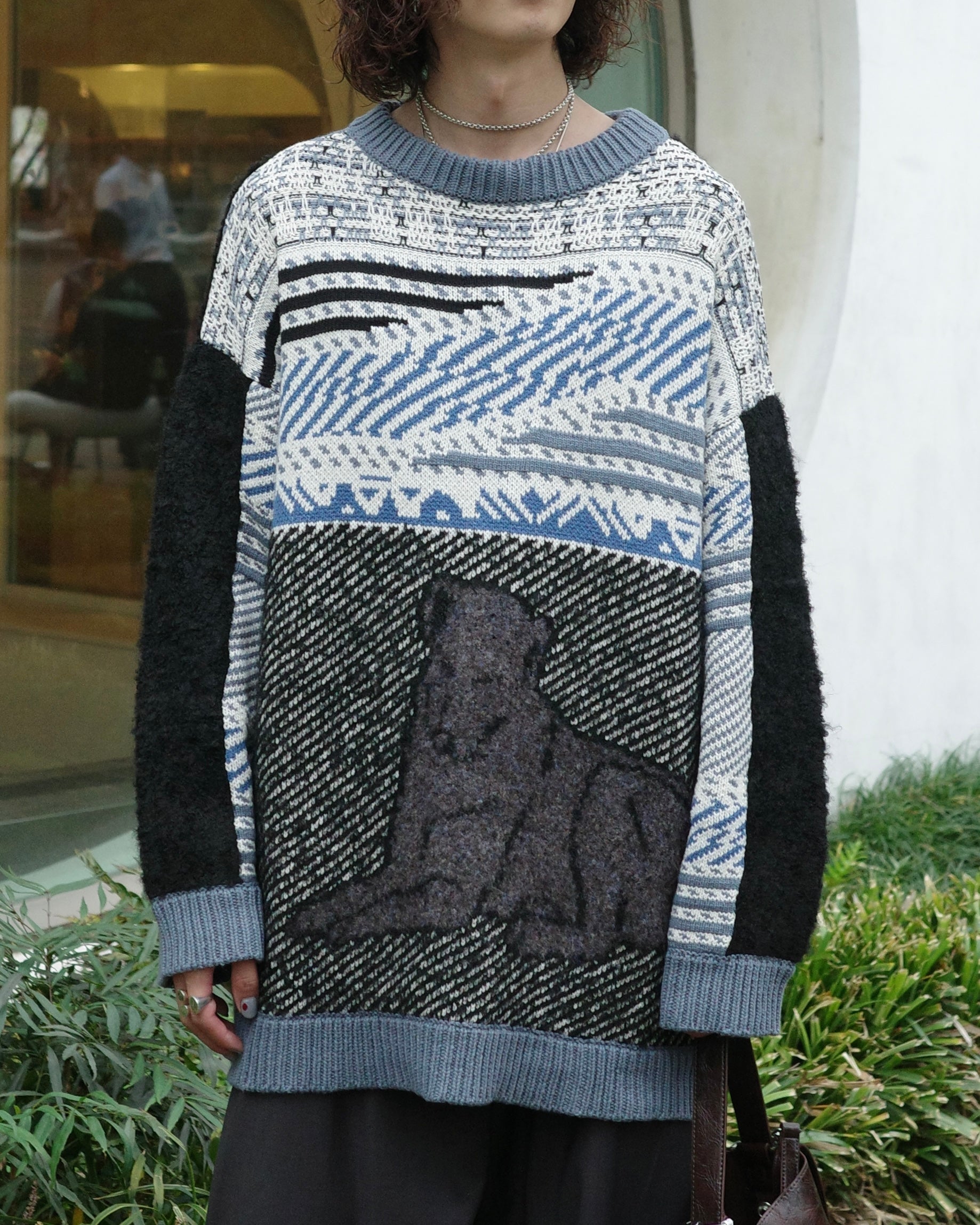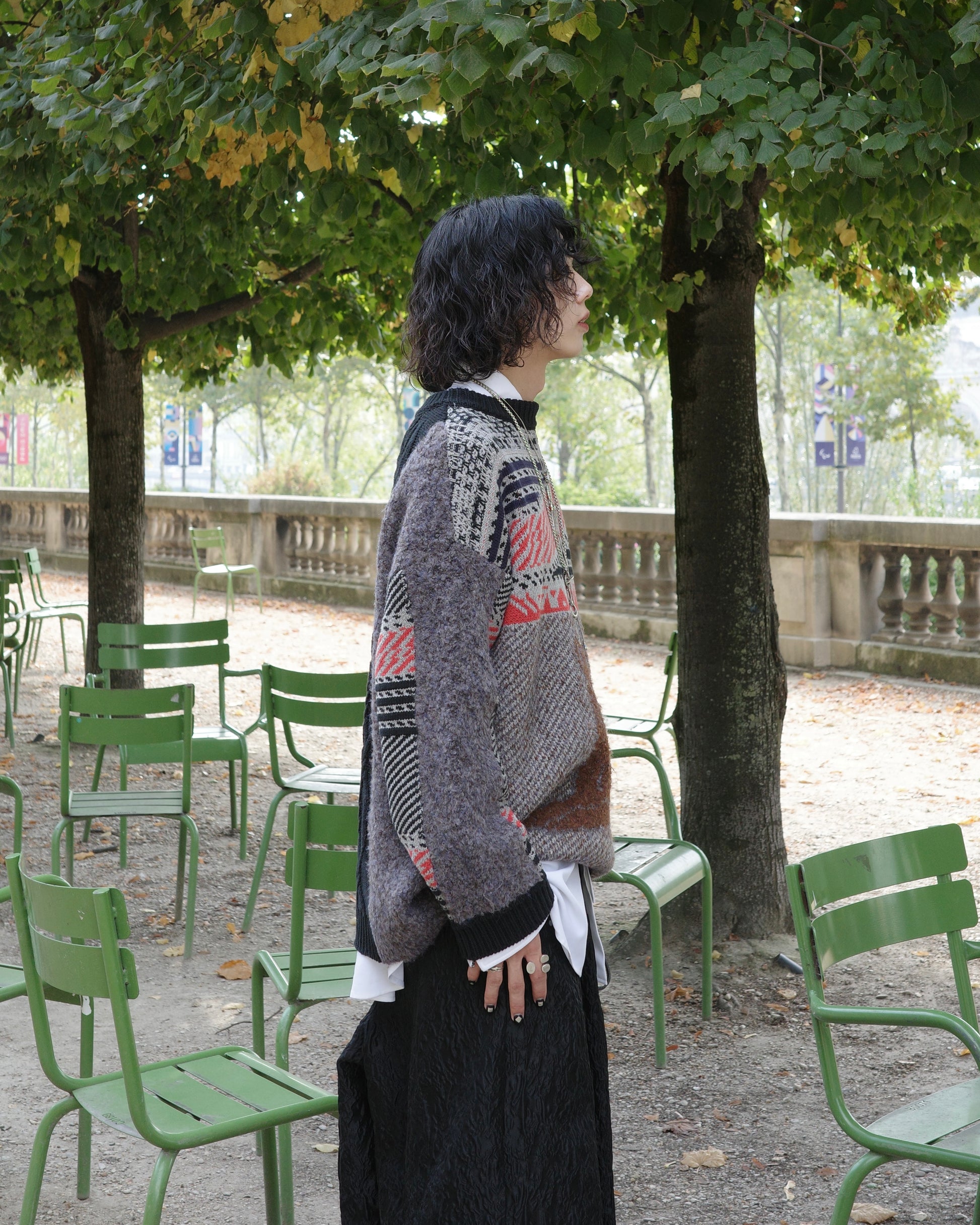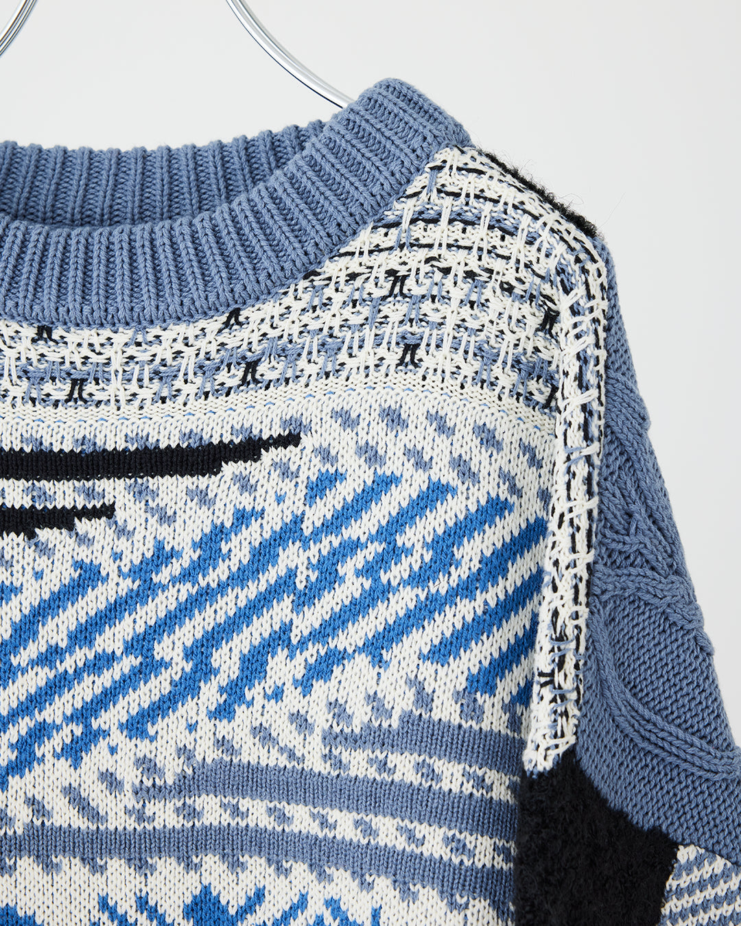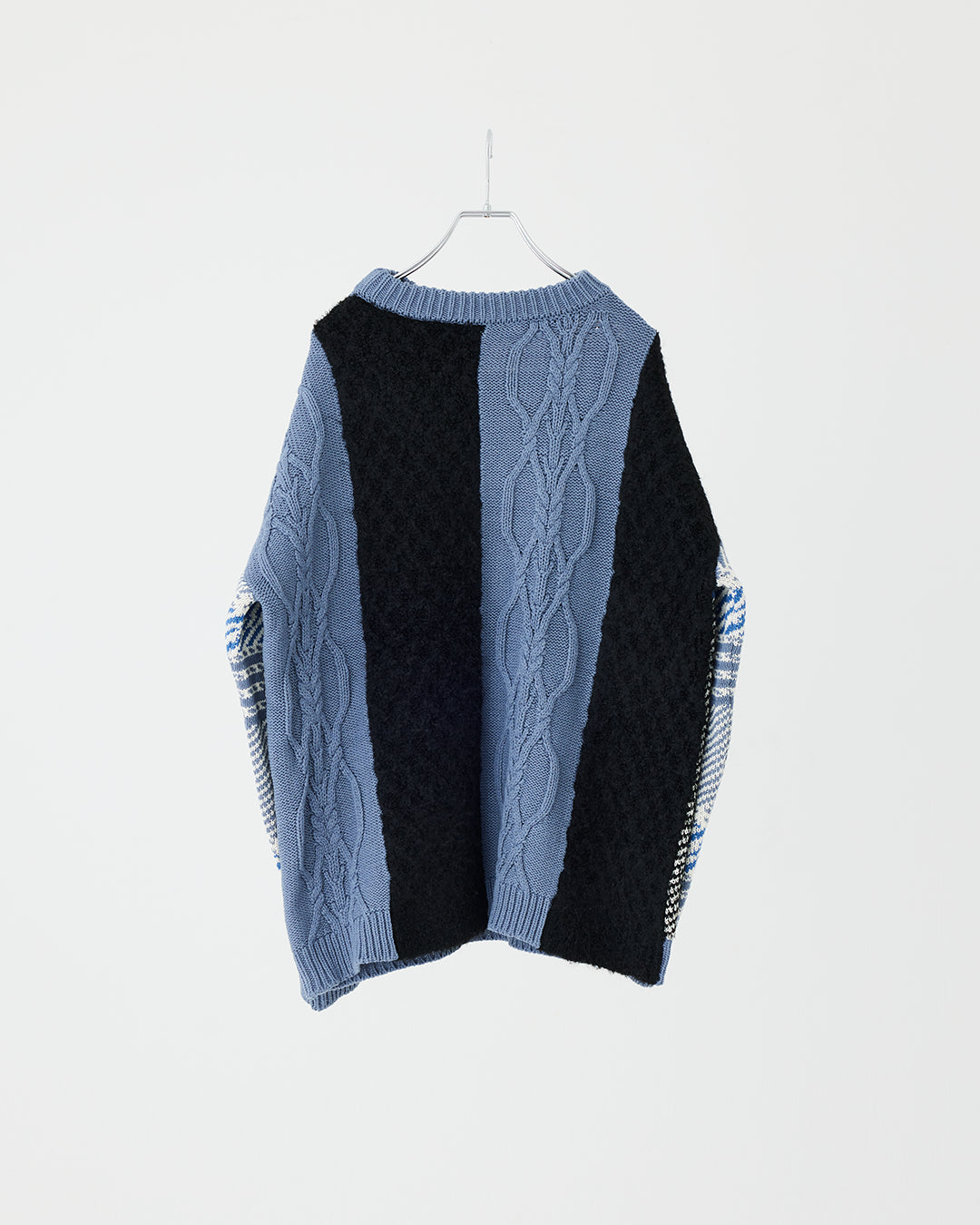 2種類の風合いの違う糸を使い、複数の編み柄を組み合わせたオーバーサイズニット。