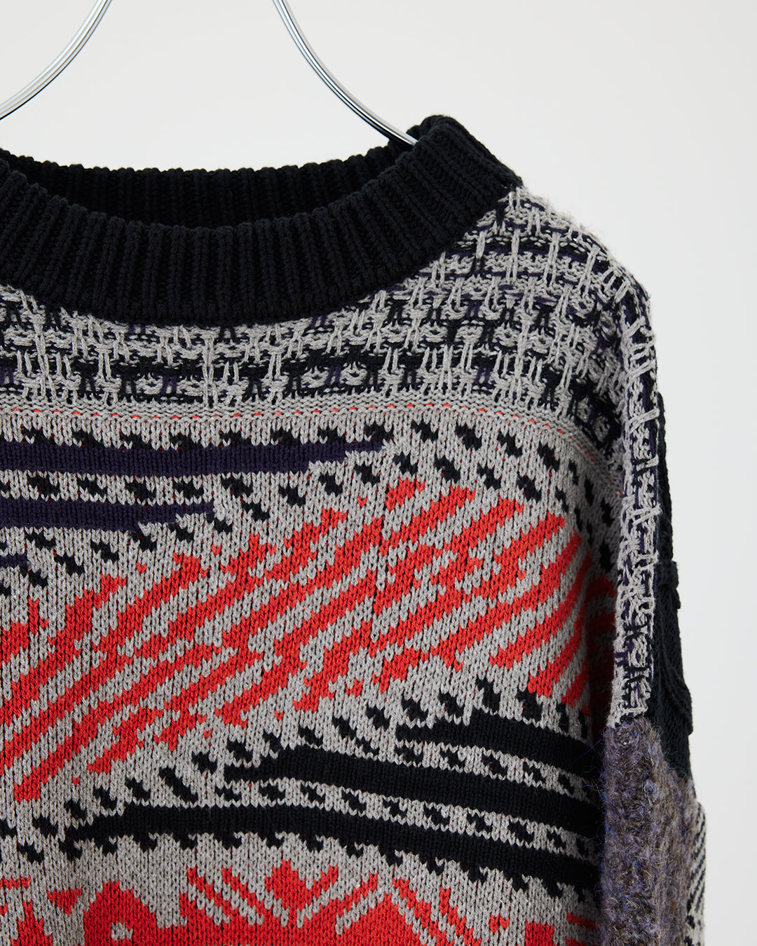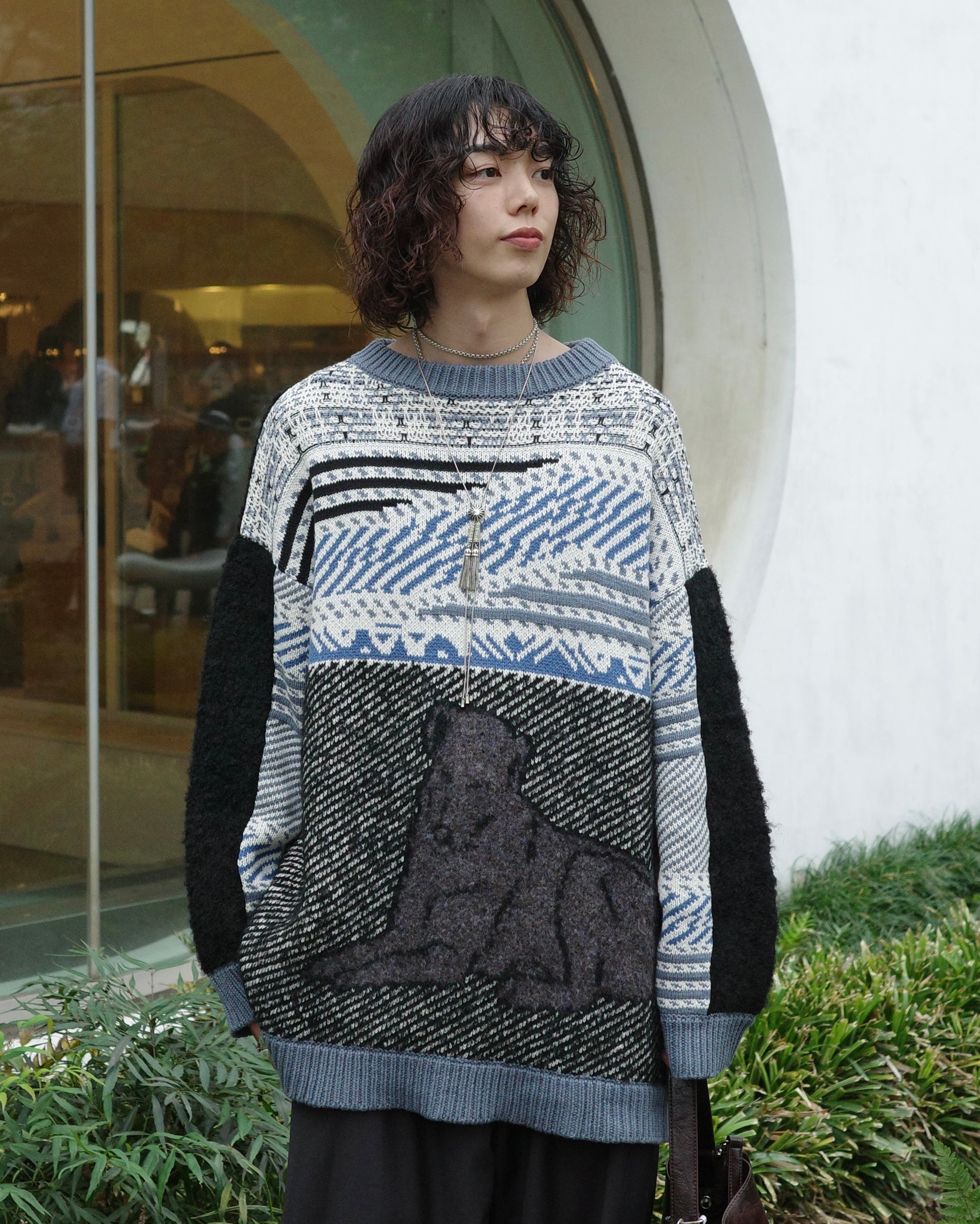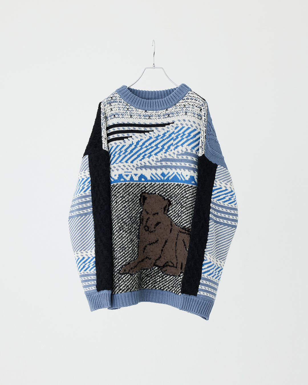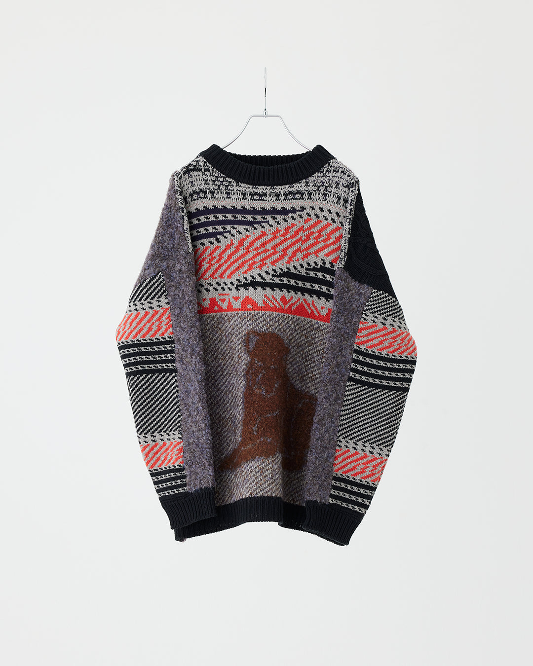 2種類の風合いの違う糸を使い、複数の編み柄を組み合わせたオーバーサイズニット。
