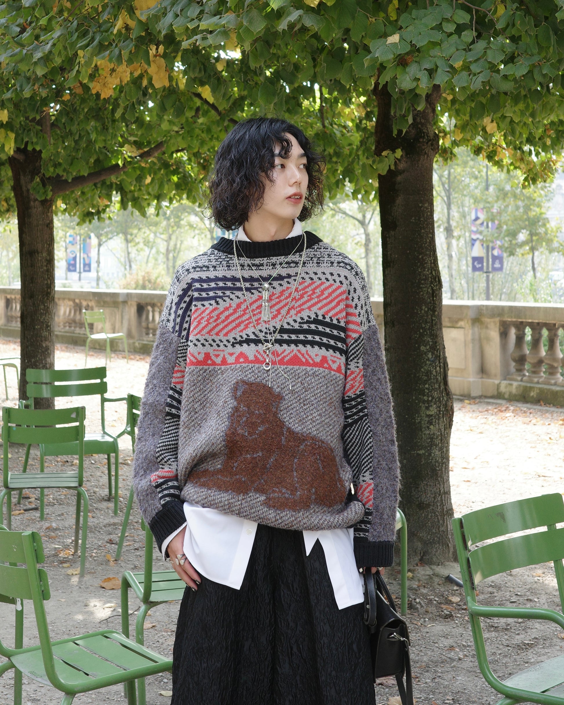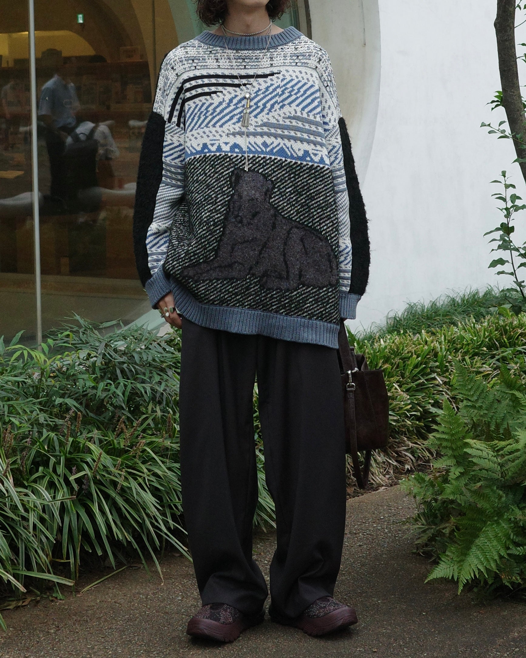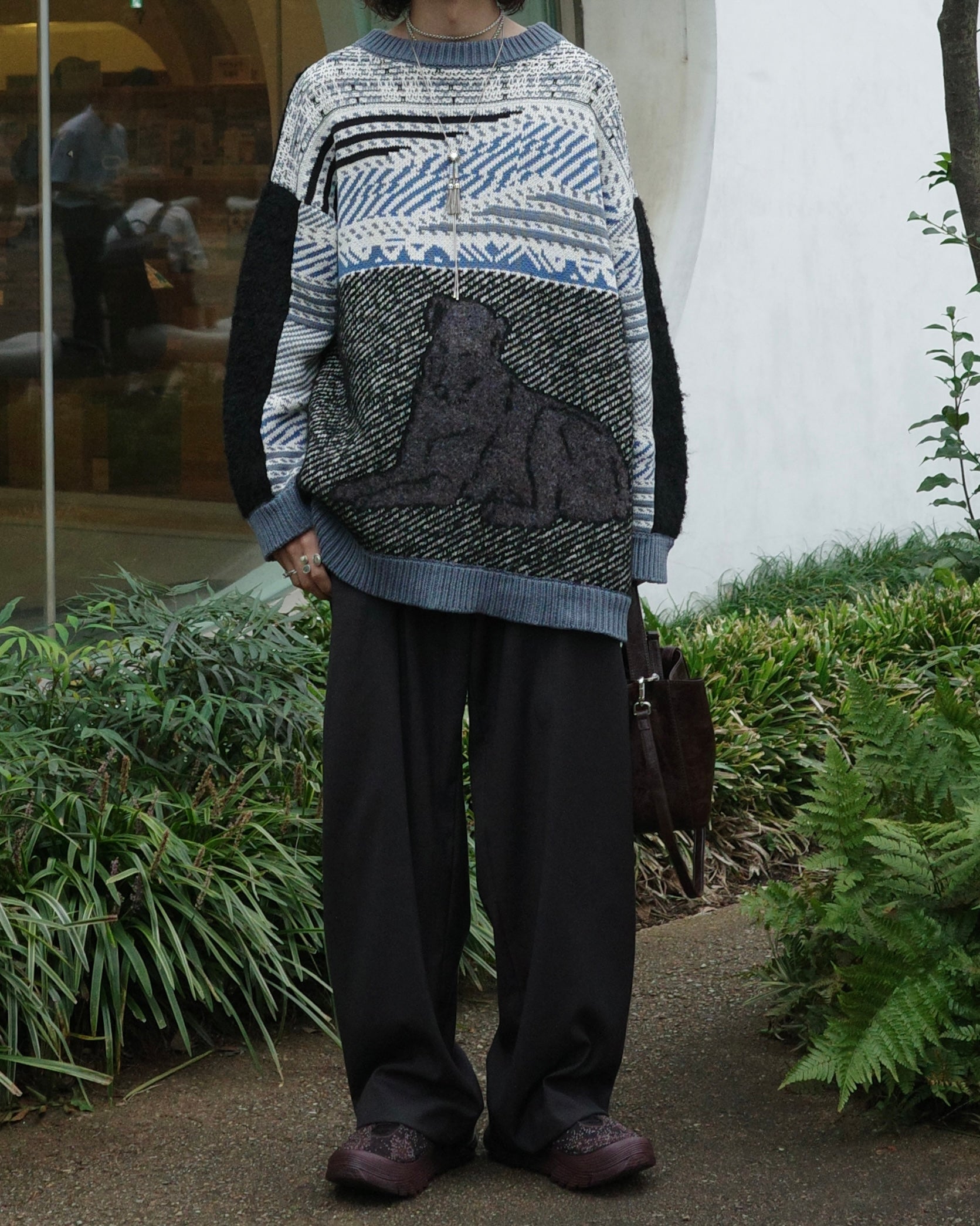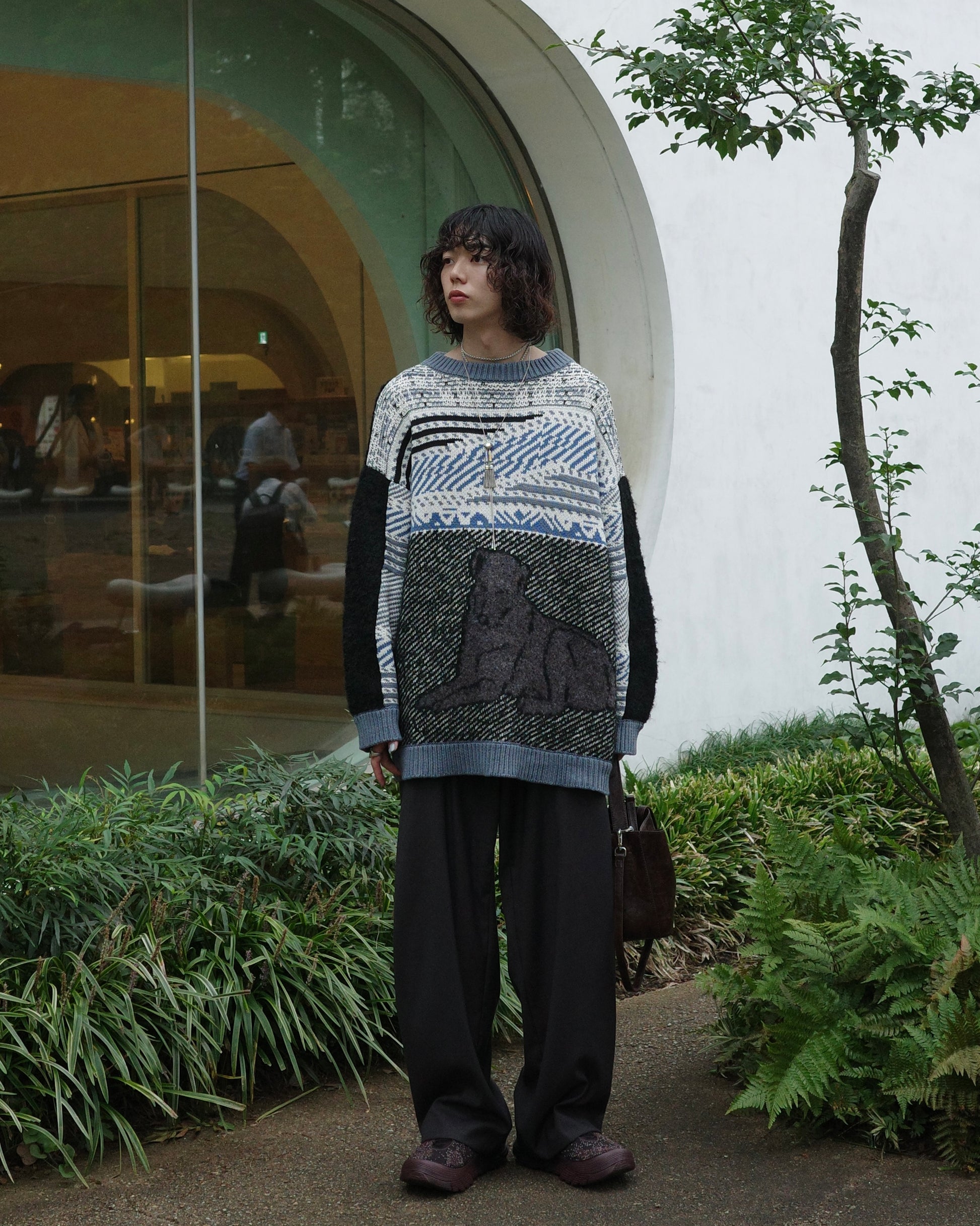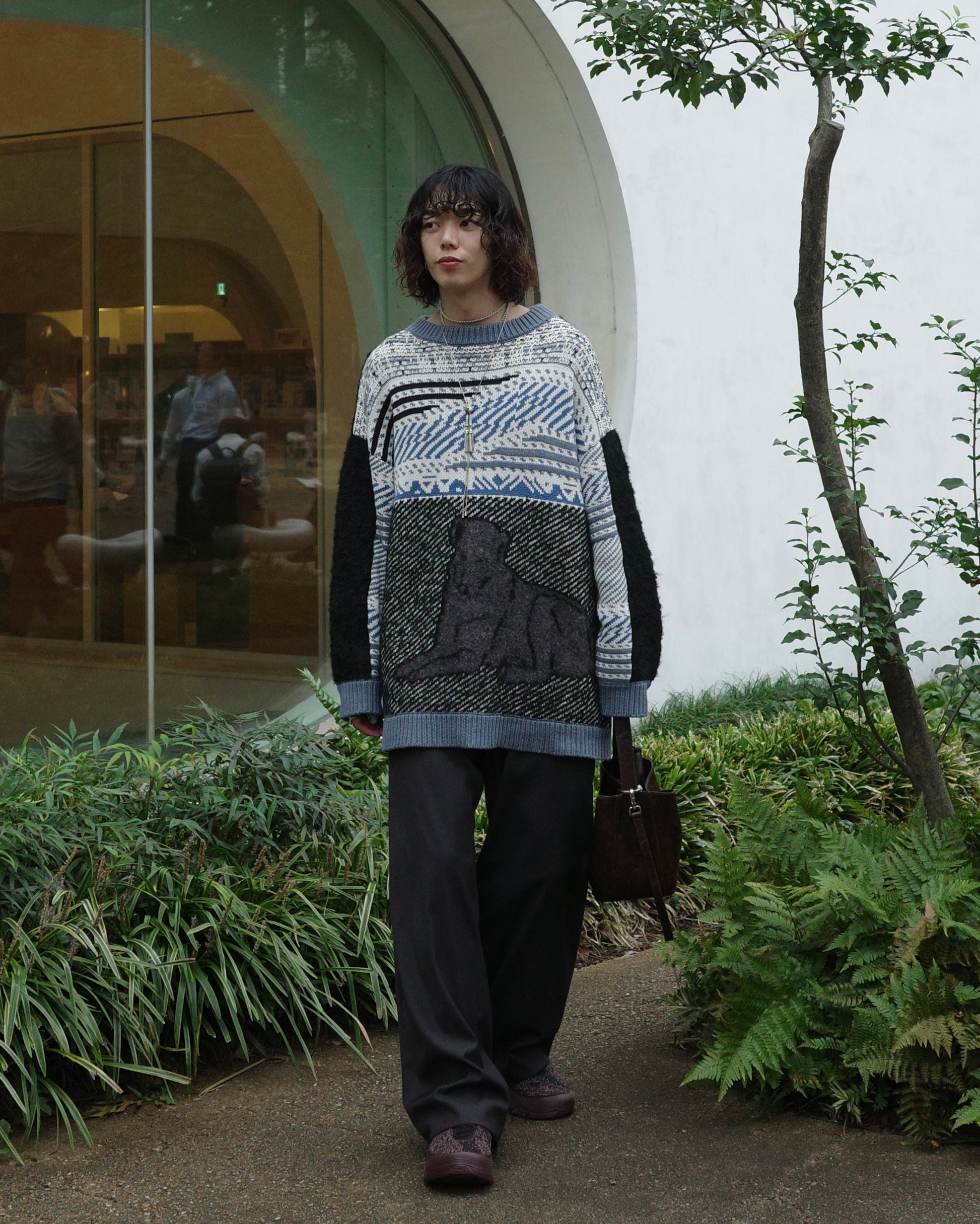 2種類の風合いの違う糸を使い、複数の編み柄を組み合わせたオーバーサイズニット。