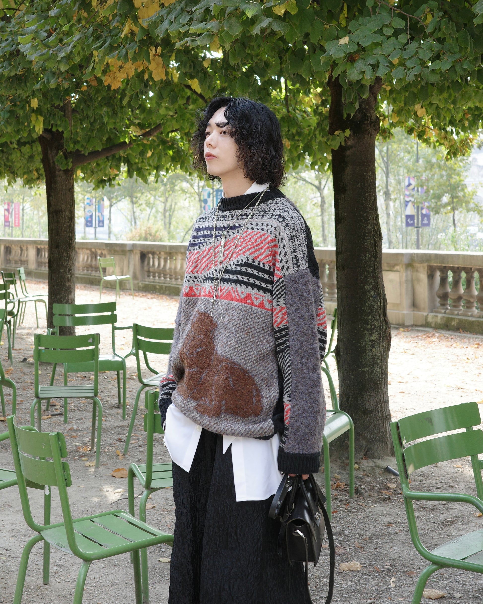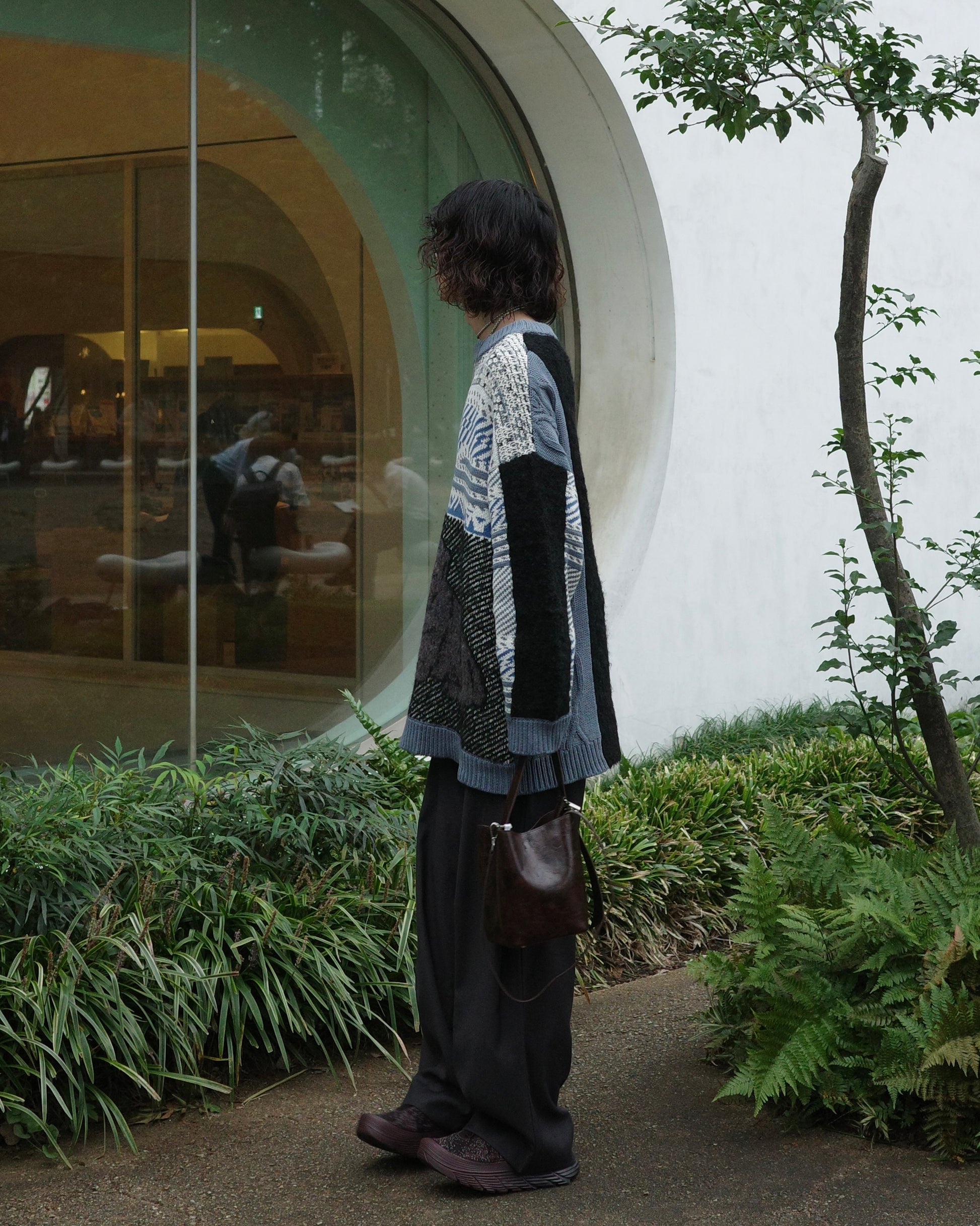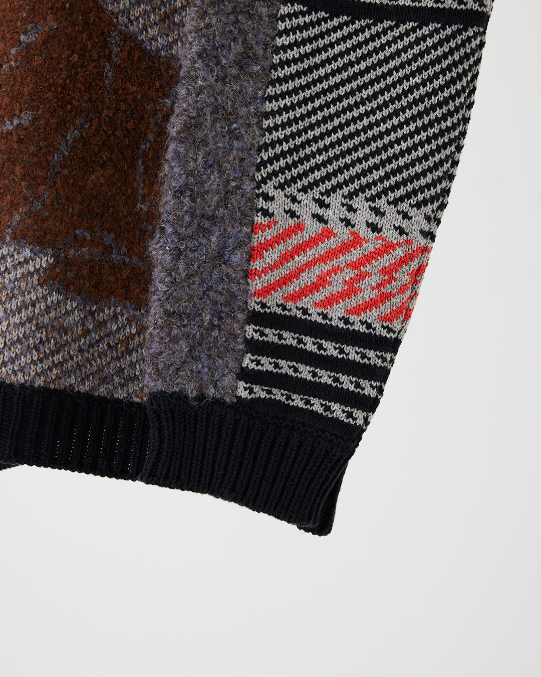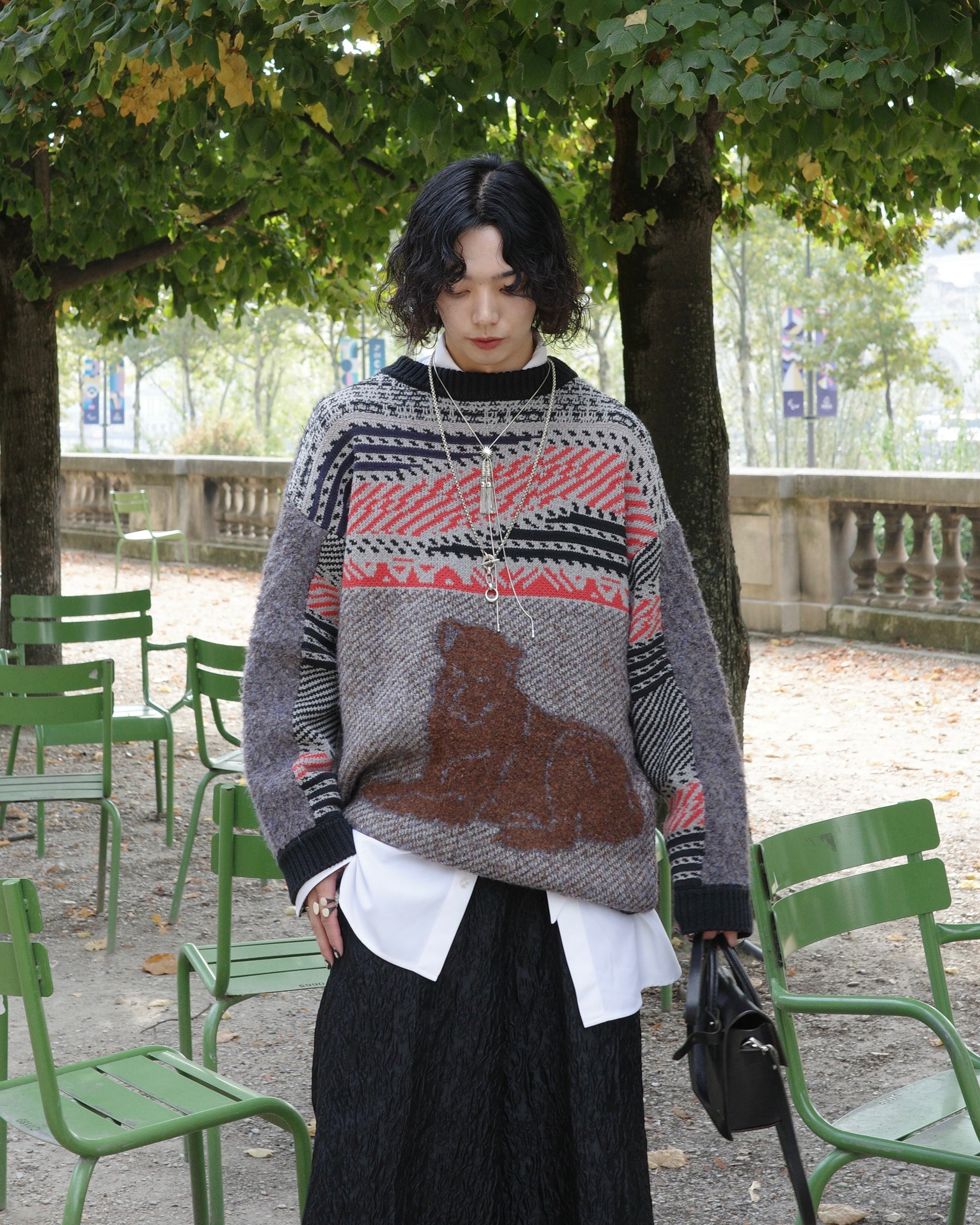 2種類の風合いの違う糸を使い、複数の編み柄を組み合わせたオーバーサイズニット。