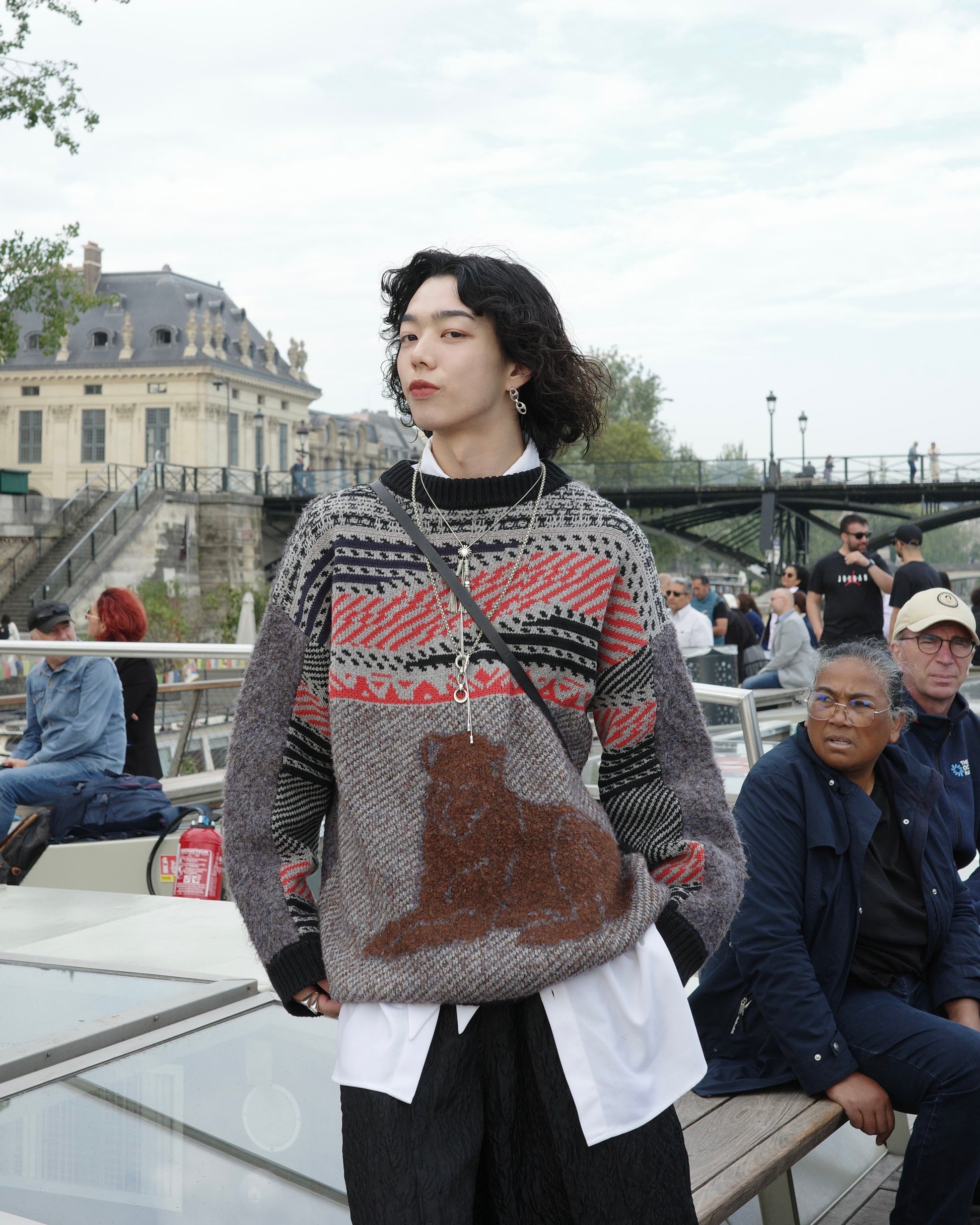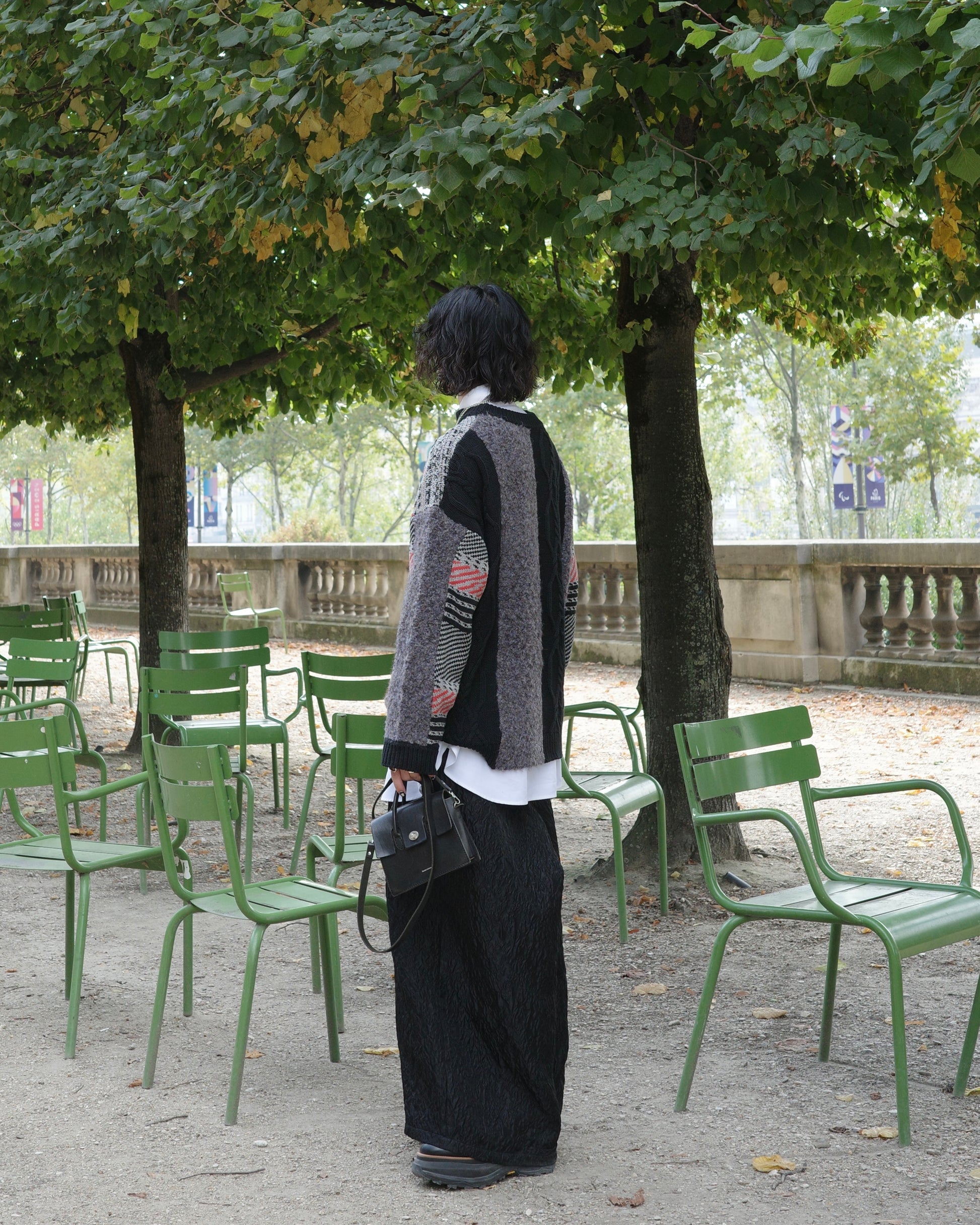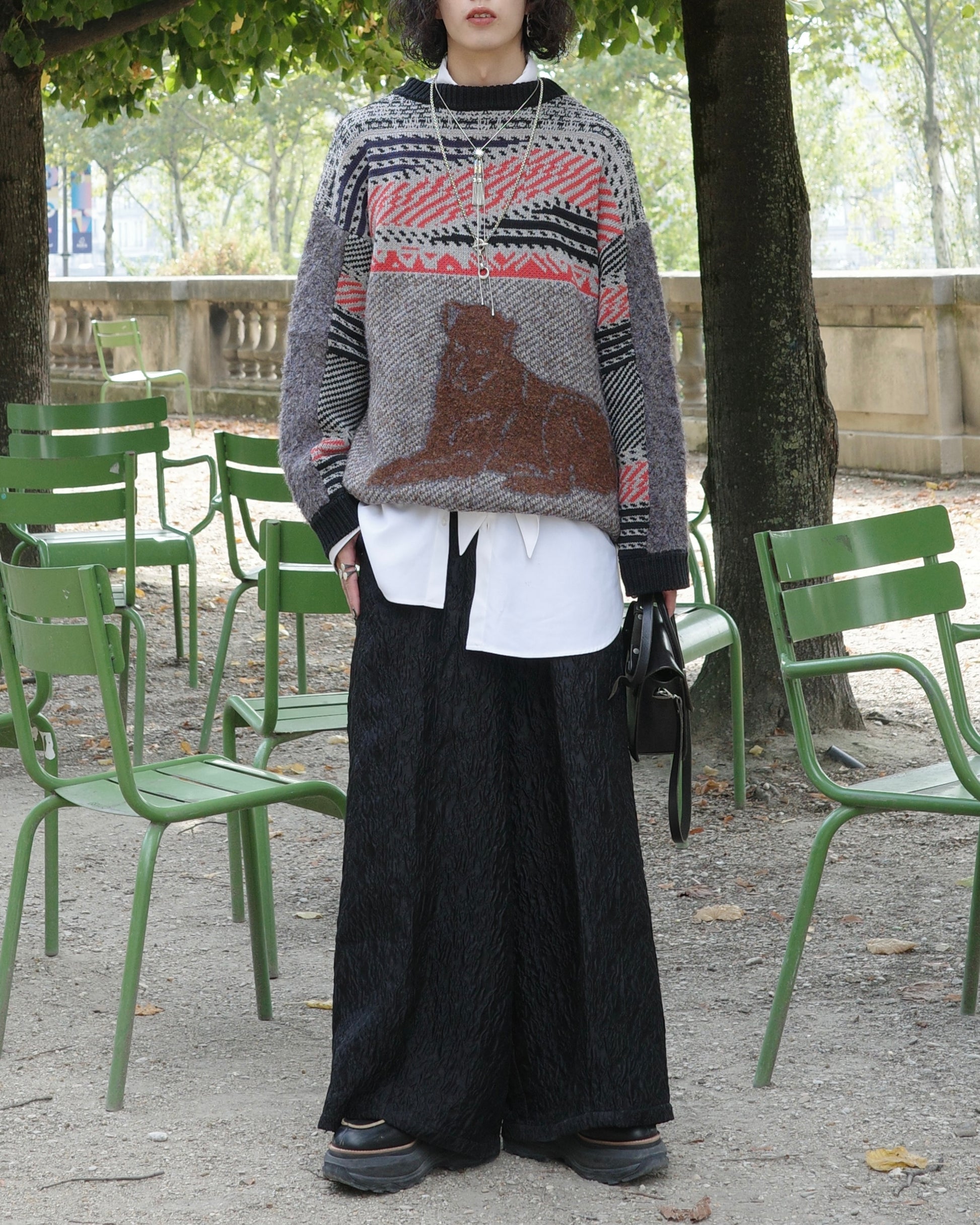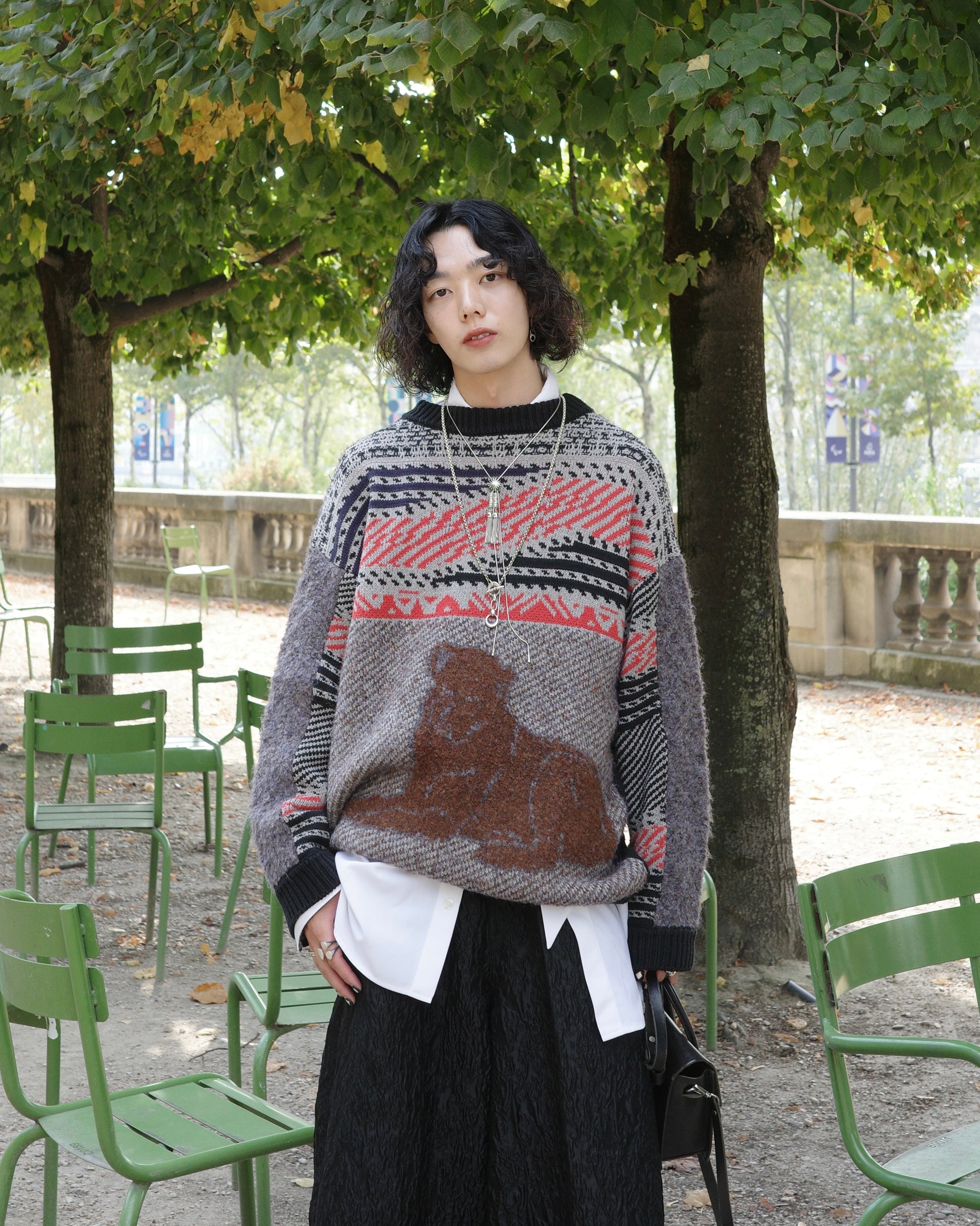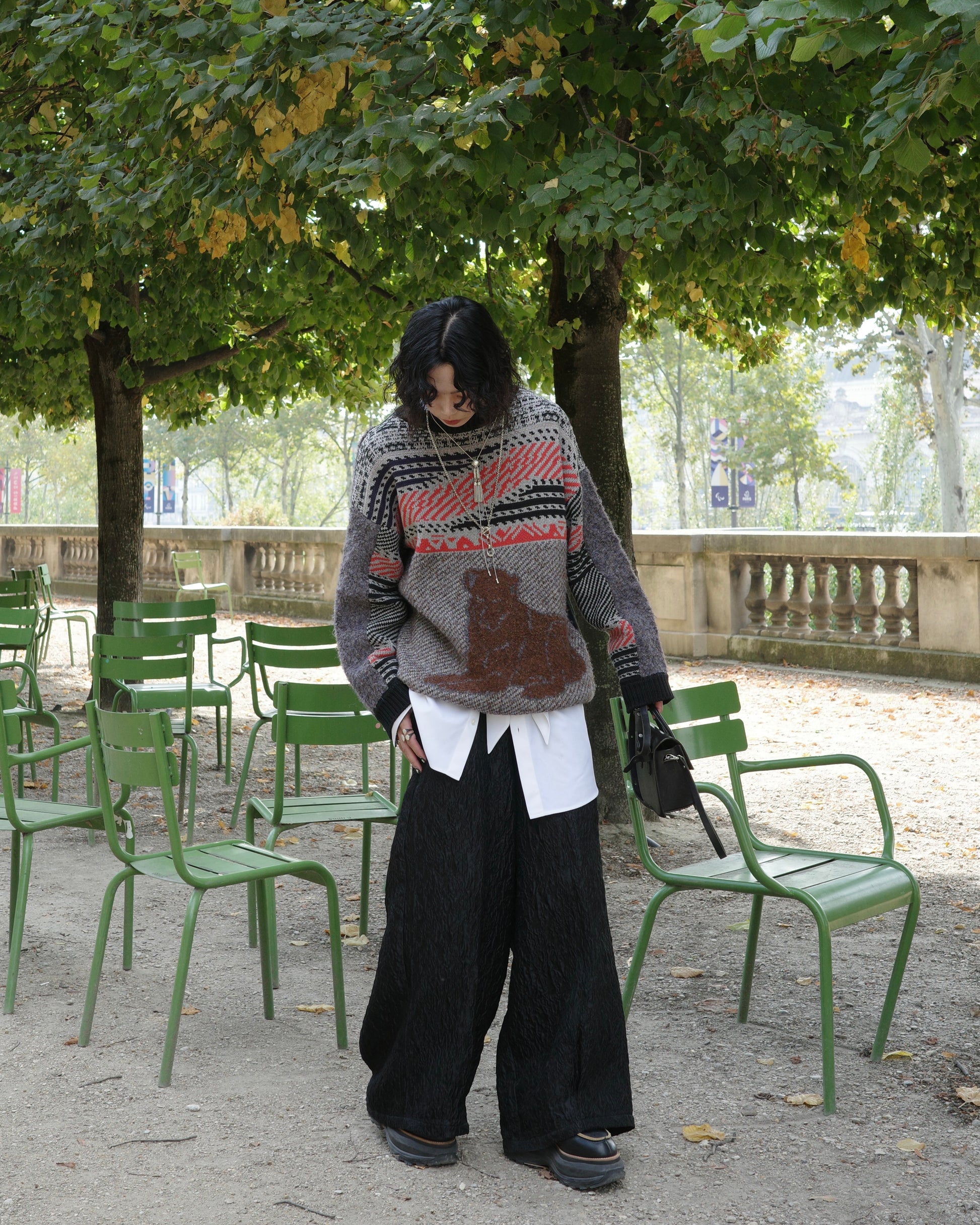 2種類の風合いの違う糸を使い、複数の編み柄を組み合わせたオーバーサイズニット。
