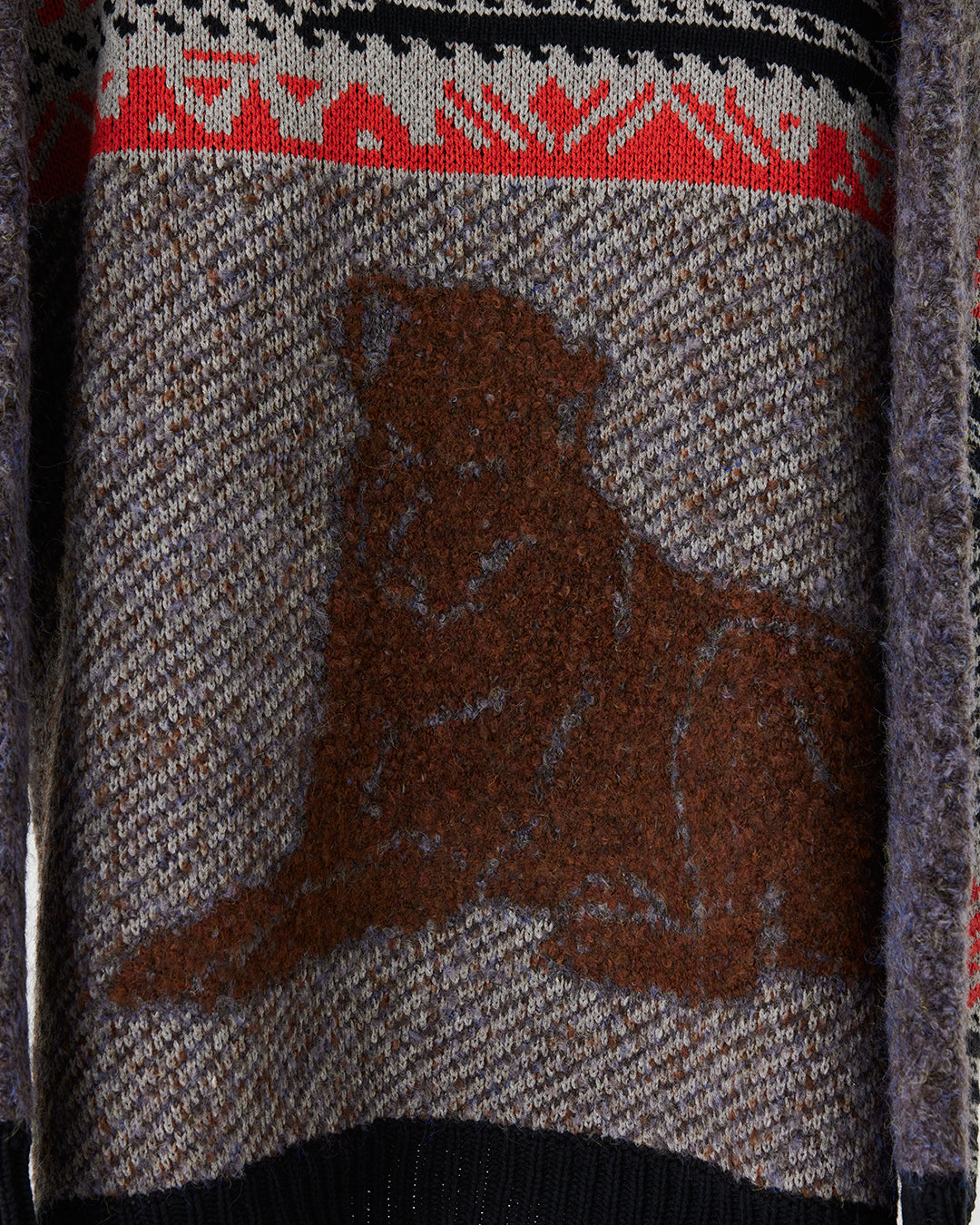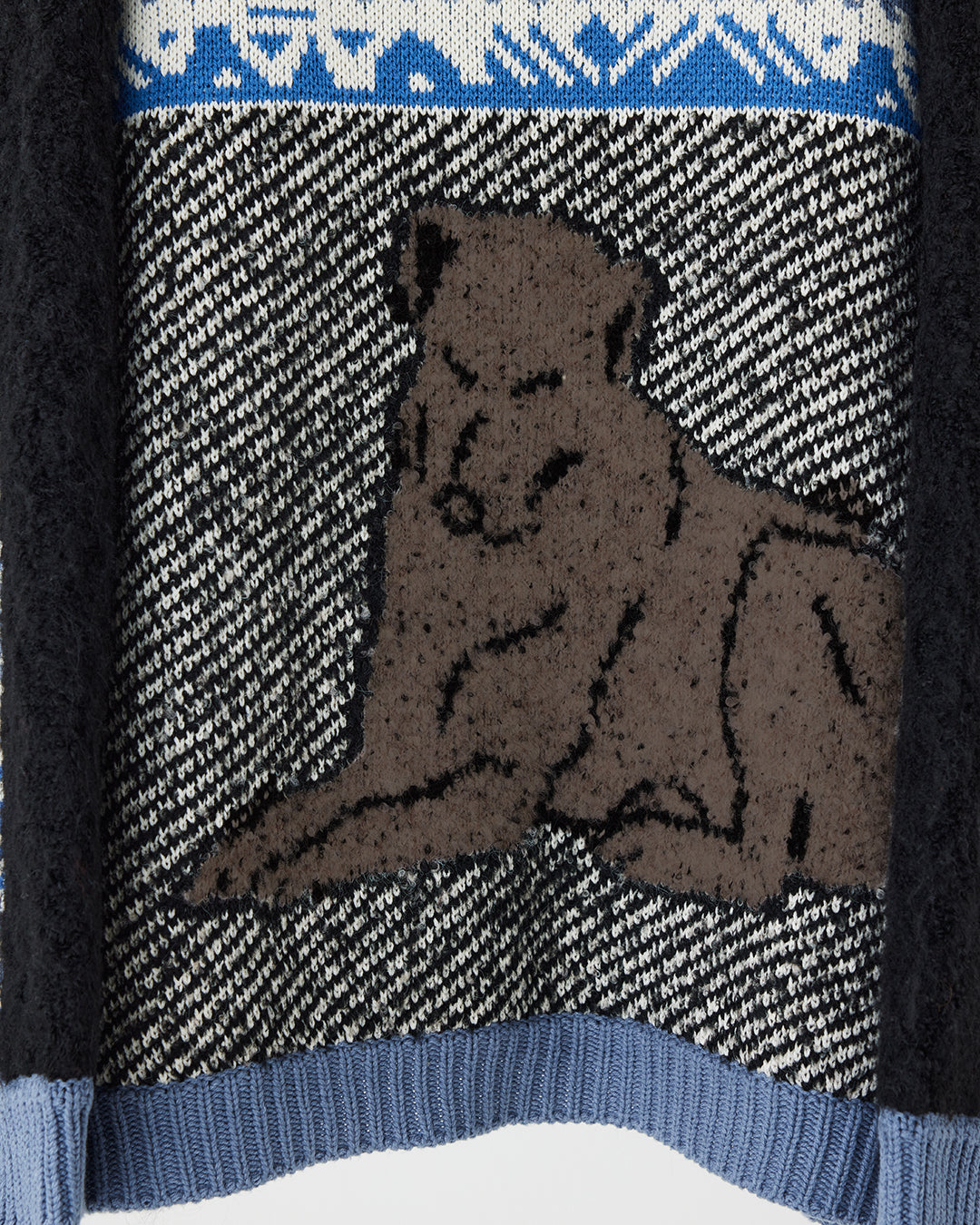 袖の切り替え部分とフロントの犬のモチーフにはブークレー糸を使い、立体感を表現しています。